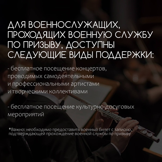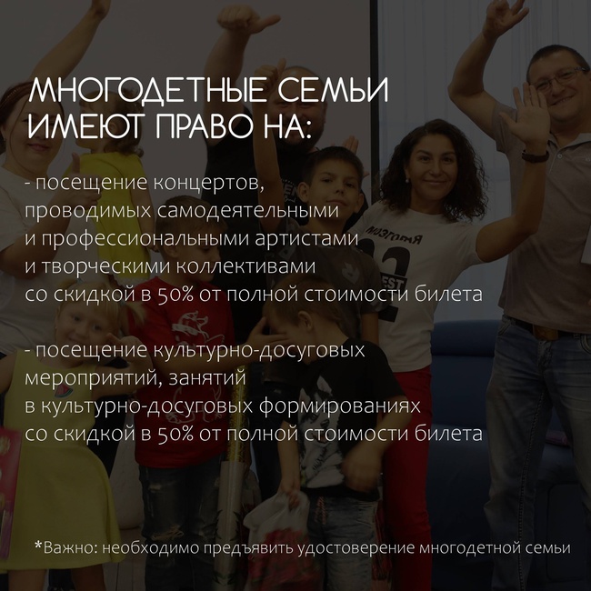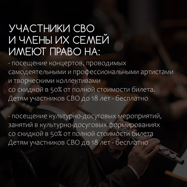— посещение концертов, проводимых самодеятельными и профессиональными артистами и творческими коллективами – 50 процентов от полной стоимости билета (детям участников СВО до 18 лет – бесплатно);